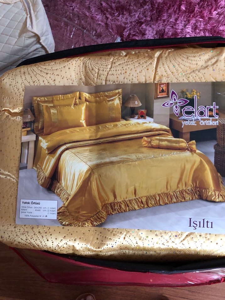 Parlak altın renkli, işlemeli yatak örtüsü "Isilti" yazısıyla zarif bir dokunuş sağlar. ️