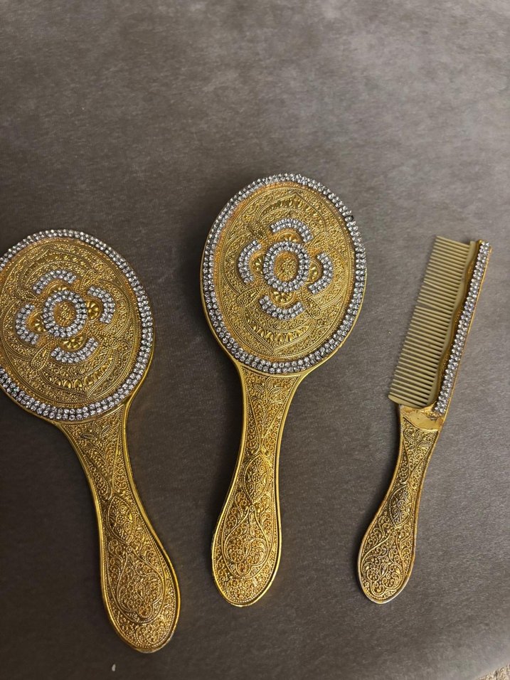 Altın renginde, işlemeli ve küçük taşlarla süslenmiş iki saç fırçası ve bir tarak seti. ✨