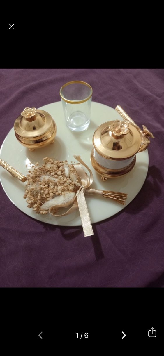 İşlemeli desenlere sahip parlak altın renkli geleneksel sofra takımı, kapaklı kaplar ve bir bardak içerir. Beyaz tabakta kurutulmuş çiçek süslemesi bulunur. ️