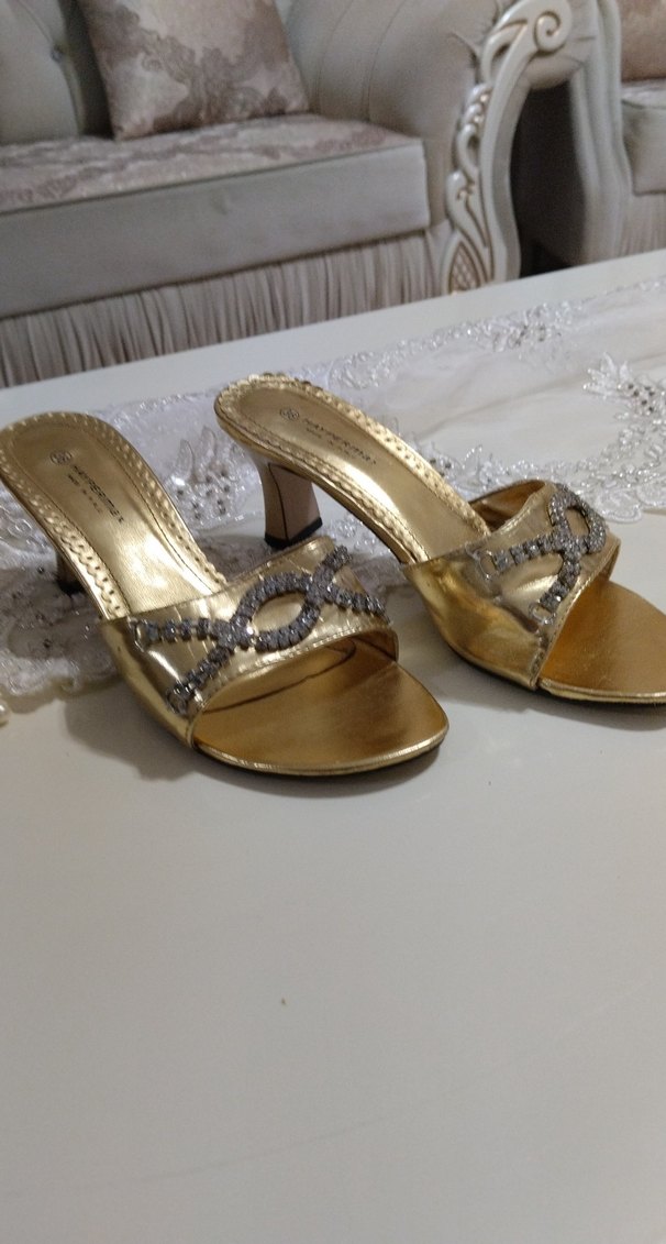 İpek gibi altın renkli, işlemeli ve payet detaylı stiletto topuklu terlikler. Düğünler için şık ve göz alıcı. ✨