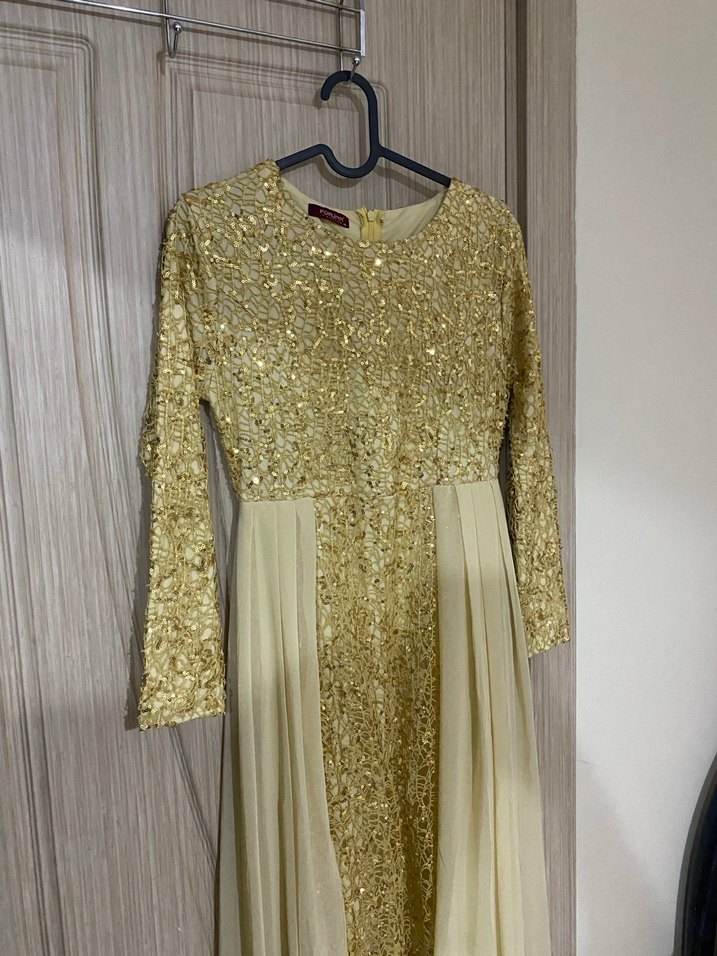 Uzun kollu, yuvarlak yaka ve işlemeli detaylara sahip altın renkli uzun abiye elbise. Drapeli kumaşı ve dar kesimiyle modern klasik şıklık sunar.