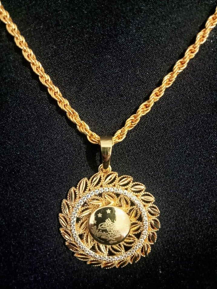 İşlemeli yuvarlak kolye ucu ve detaylı uzun zinciriyle klasik tarzda altın renkli kolye. ✨