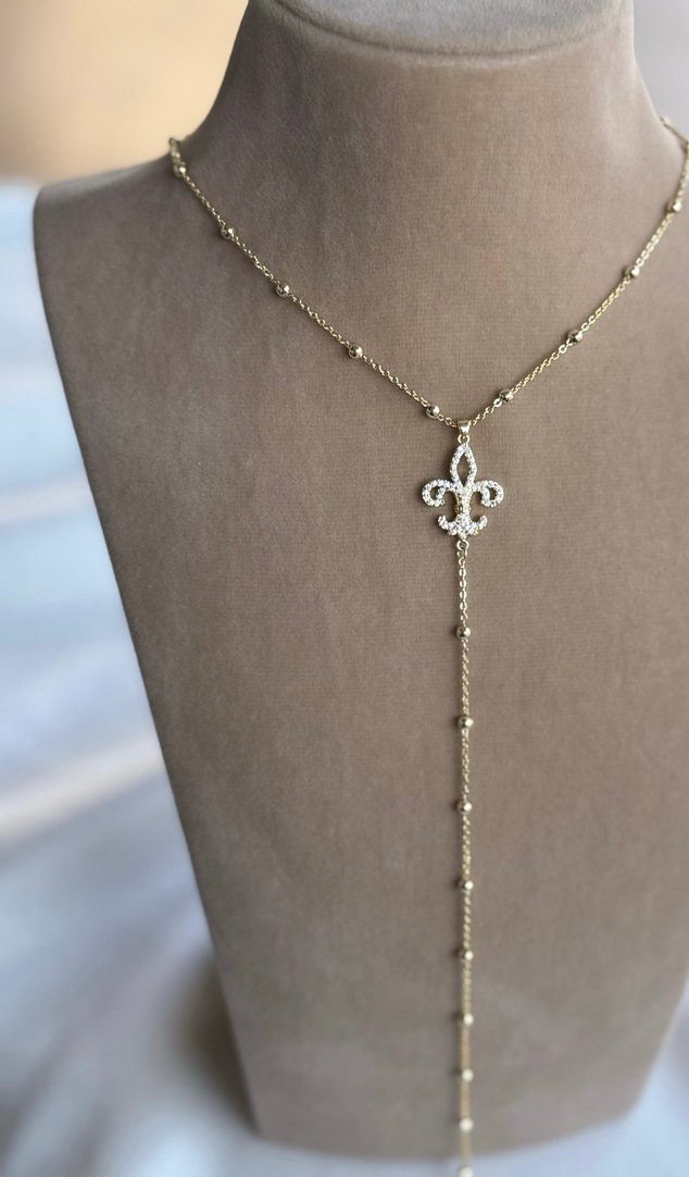 Altın renginde, işlemeli kolye ucu ve detaylı zincir bağlantılarına sahip, klasik bohem Paris tarzında midi uzunlukta kolye.