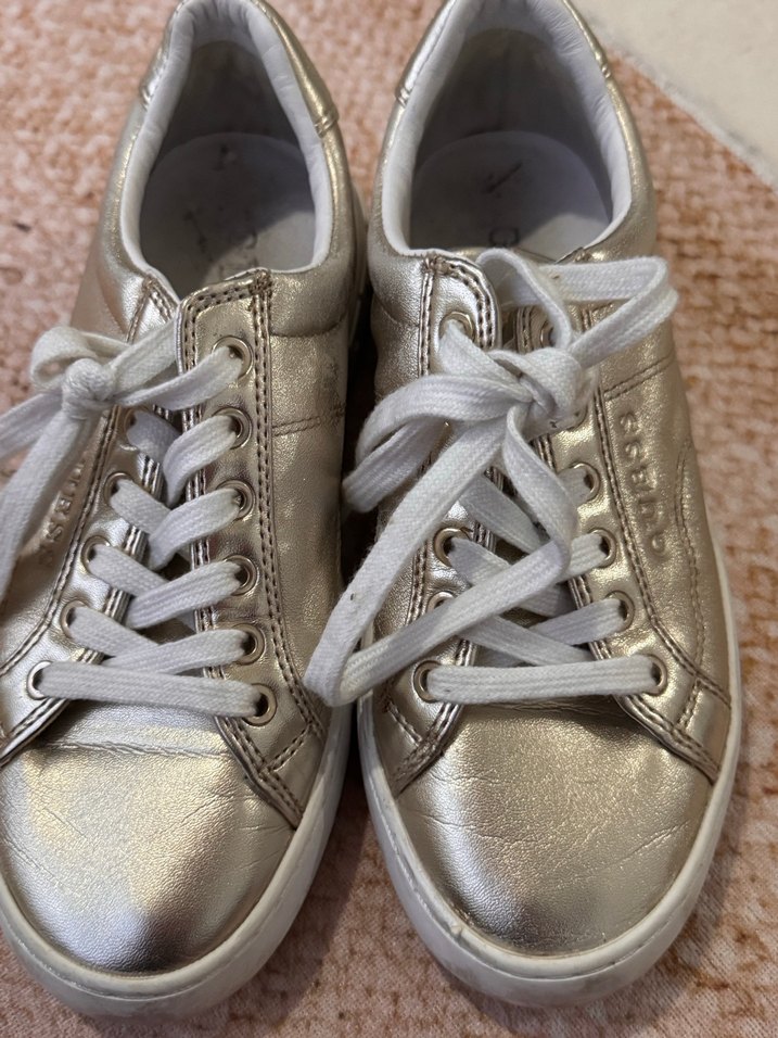 Altın renkli, bağcıklı ve dolgu topuklu kadın spor ayakkabısı. Parlak yüzeyi ve sokak stiliyle günlük kullanıma uygundur. İç kısmında hafif renk atması var ayakta belli bile olmuyor