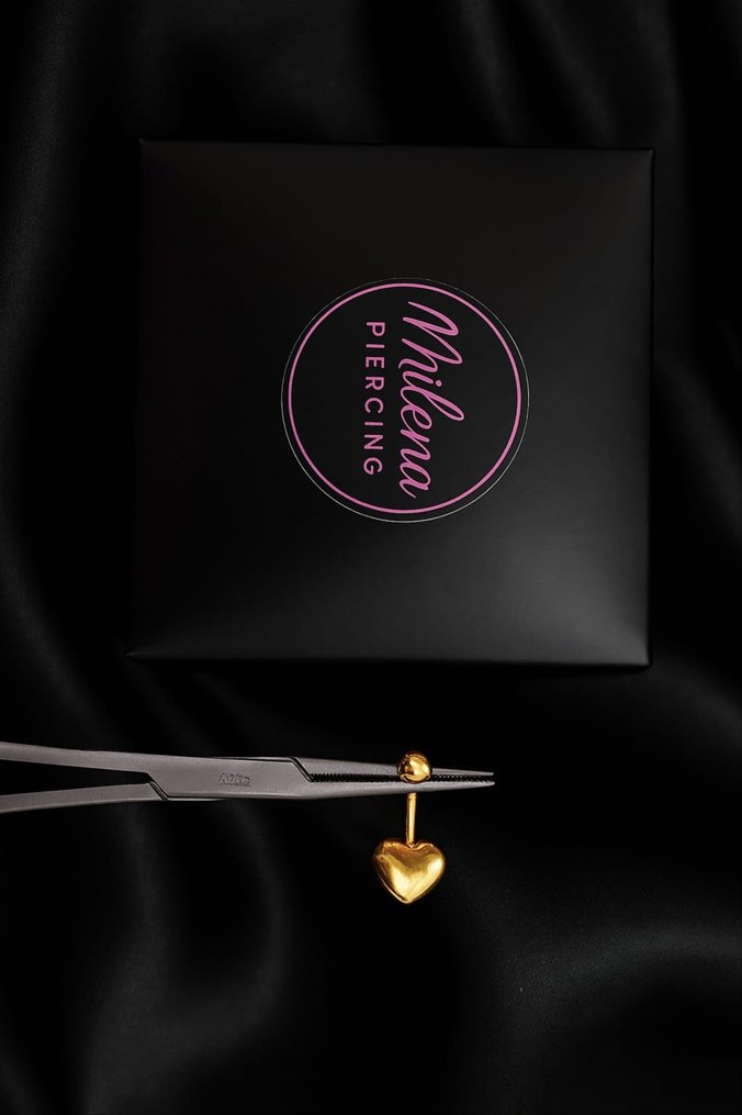 Koyu altın renkli, kalp figürlü kadın piercingi,. Cesur ve gösterişli gotik tarzda.