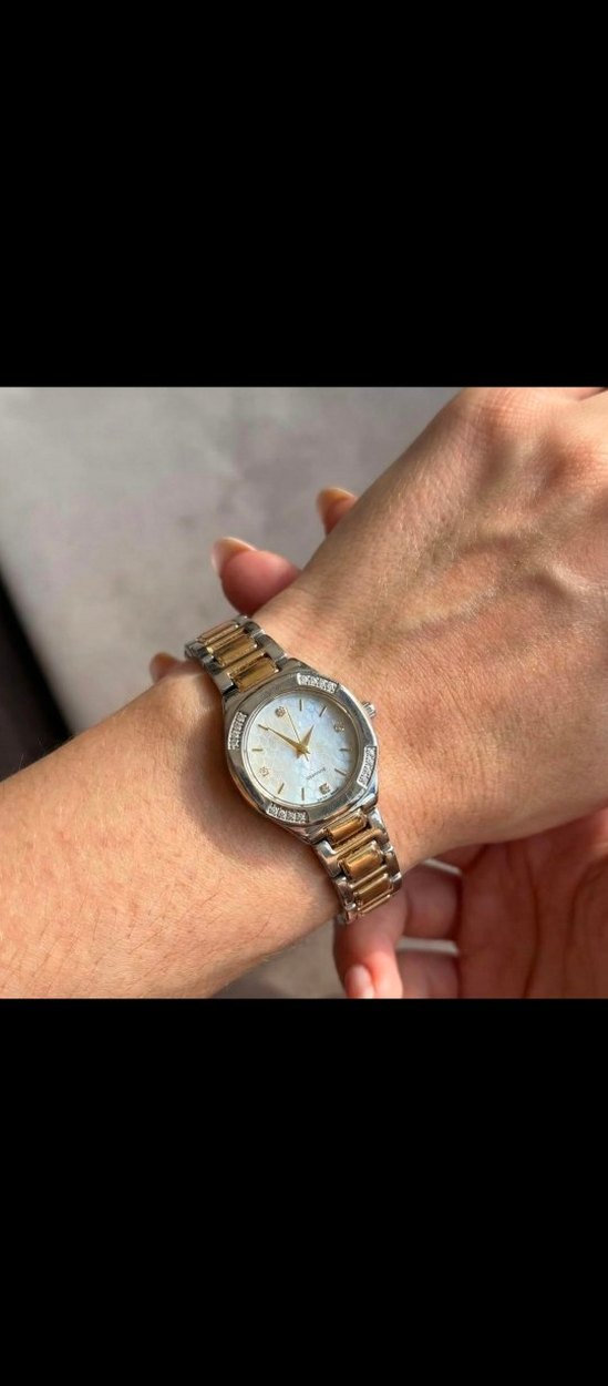 Altın ve gümüş renkli, düğmeli bilezikli kadın kol saati. Klasik yuvarlak kadran ve zarif kristal detaylarla modern klasik şıklık sunar. ⌚