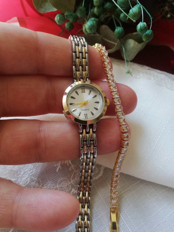 Altın renkli metal kordonlu, modern klasik tasarıma sahip kadın kol saati, klasik zarafeti renkli detaylarla birleştiriyor. ⌚