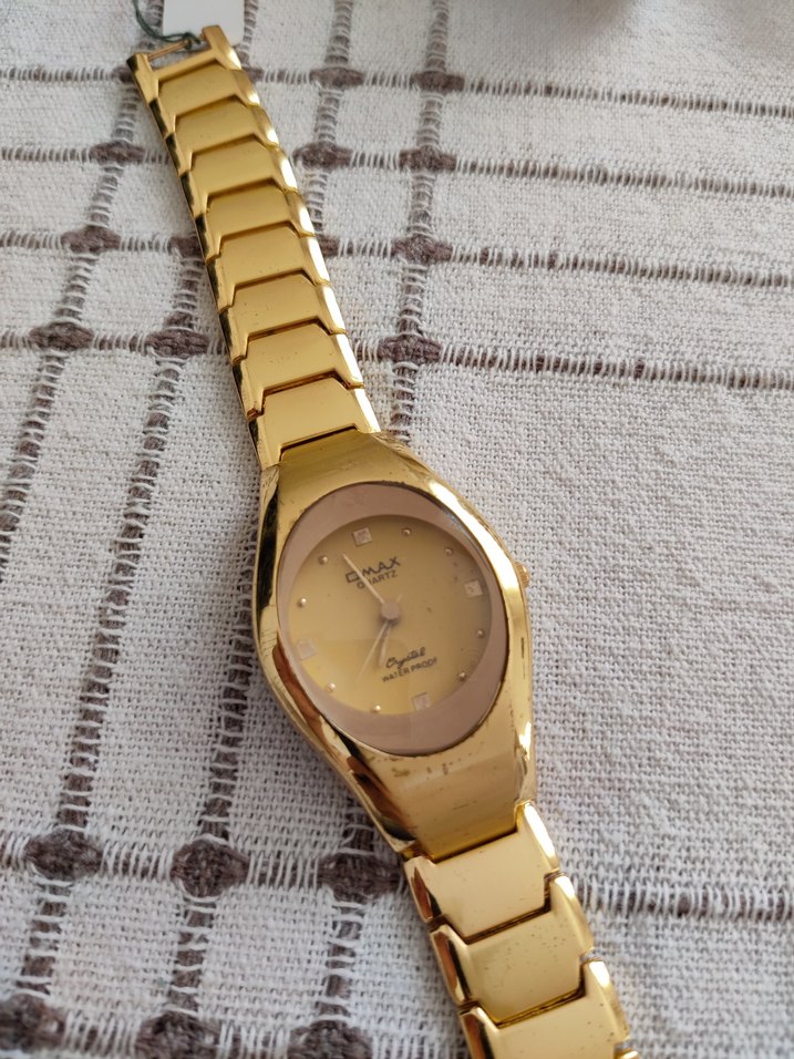 Parlak altın renkli, kemerli tasarımlı kadın saati, klasik zarafet ve çağdaş stili bir arada sunar. Sıfır olup kullanılmadı, uzun süre beklemeden dolayı renginde soyulma vardır