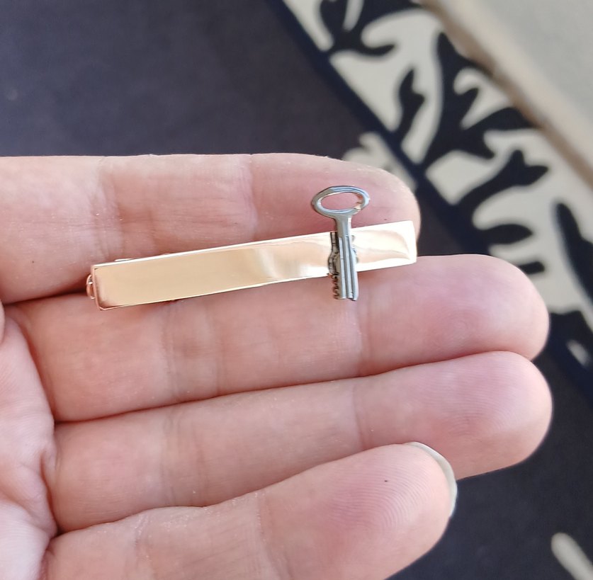 Parlak altın renkli, minimal tasarımlı kadın kol düğmesi, küçük anahtar detayı ve ince bir yarık içerir. Günlük kullanım için uygundur.