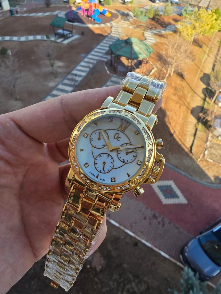 Altın renkli metal kayışlı, tokalı kadın kol saati. Klasik ve renkli kadranı küçük kristallerle süslenmiştir. Klasik zarafet ve sokak stili bir arada. ⌚