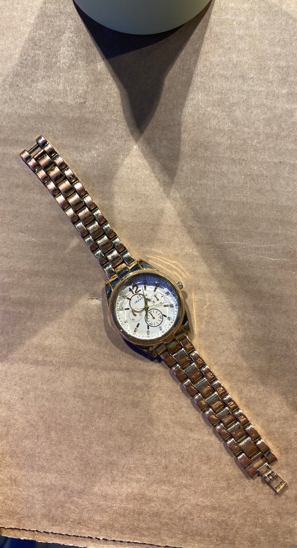 Altın renkli, parlak metal kayışlı, tokalı kadın kol saati.