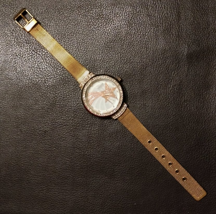 Altın renkli tokalı kayışa sahip kadın kol saati, yuvarlak kadranda yıldız desenli. Vintage Paris sokak modası tarzında, gri zeminli. ⌚sayılı ve temiz kullanılmıştır. hiçbir kusuru yoktur. ayrıntılı fotoğraf çektim. çapı 4cm olup kordon genişliği 1,2 cmdir. kordon uzunluğu en geniş 22cmdir. sadece pil takılacak . #altın #saat #kolsaati #coliseum #calvinklein