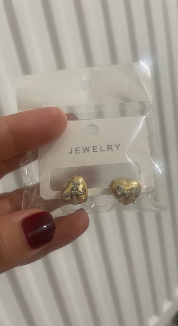 Altın renginde, küçük dekoratif tasarımlı kadın küpeleri, 'JEWELRY' yazılı kart üzerinde sunulmuştur.✨