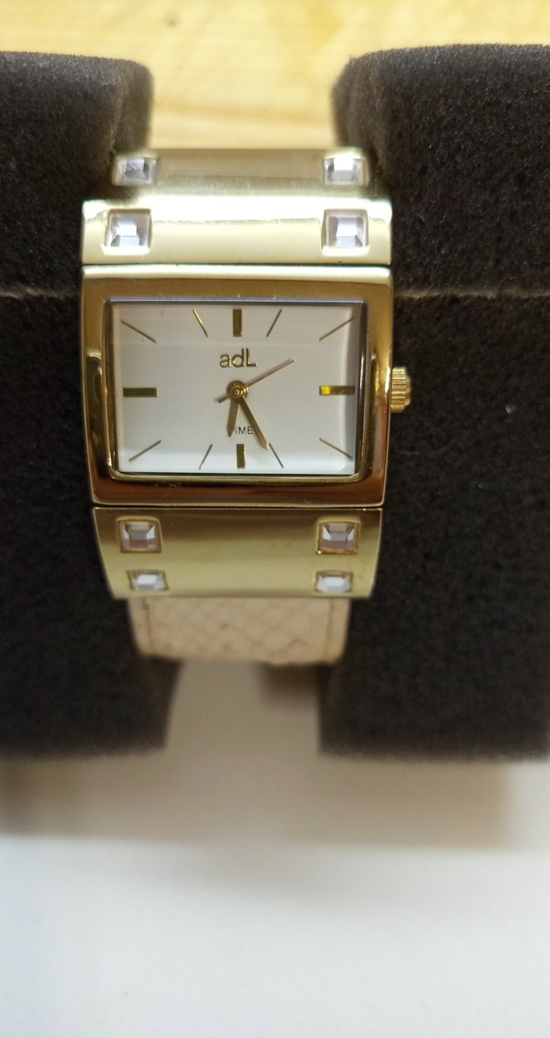 Adl markalı kadın saatte parlak altın renkli dikdörtgen kasa ve tokalı, kare taşlı kayış klasik zarafetle modern tarzı birleştirir. ⌚