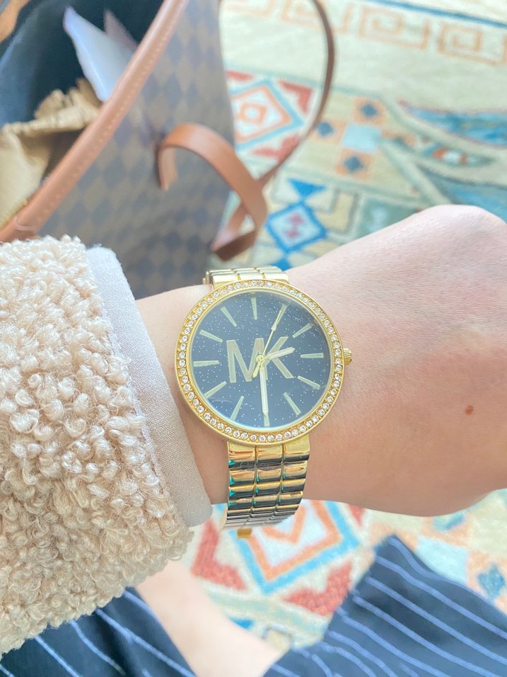 Koyu kadranlı, büyük MK logolu ve küçük taşlarla süslenmiş çerçeveli altın renkli kayışlı kadın saati. Trendy casual ve iş stiline uygun. ⌚