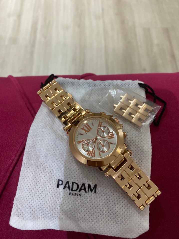 Altın renkli, tokalı kayışlı kadın saati. PADAM Paris markasına ait, üç alt kadranlı ve klasik Paris tarzında bir model. Sokak stili için uygun. ⌚
