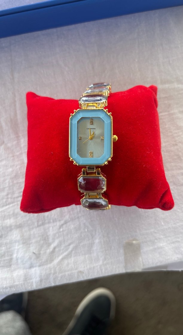 Altın renkli çerçeveye sahip kadın saati, bilezikte renkli payetli taşlarla klasik zarafeti modern tarzla buluşturuyor. ⌚