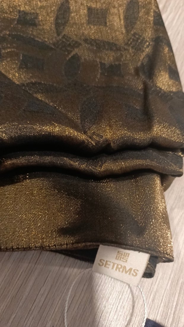 Kadınlar için parlak altın renkli, ipeksi kumaştan drapeli şal. Rahat ve şık bohem tarzına uygun. Üzerinde 'SETRMS' etiketi bulunur. ✨