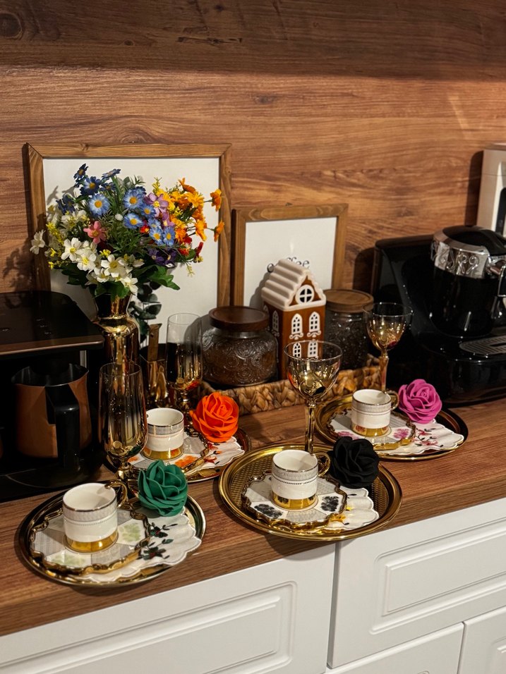 Altın renkli işlemeli kahve fincanları ve uyumlu kadehlerden oluşan set, renkli dekoratif çiçeklerle tamamlanmıştır. ☕