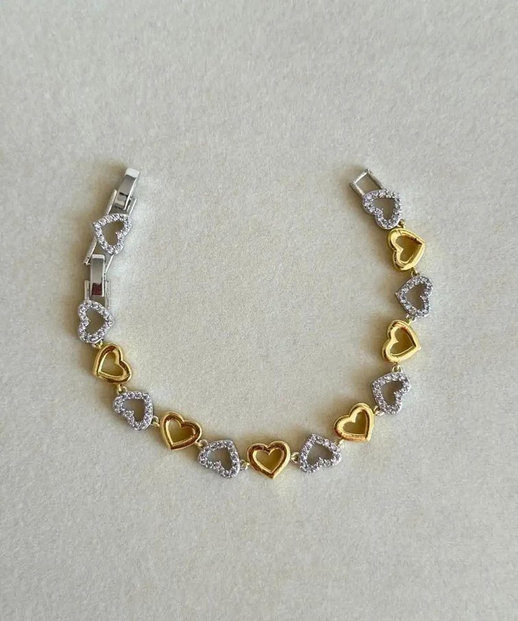 Altın renkli kalp desenleri ve payet detaylarıyla modern klasik tarzda, romantik geceler için şık bileklik.