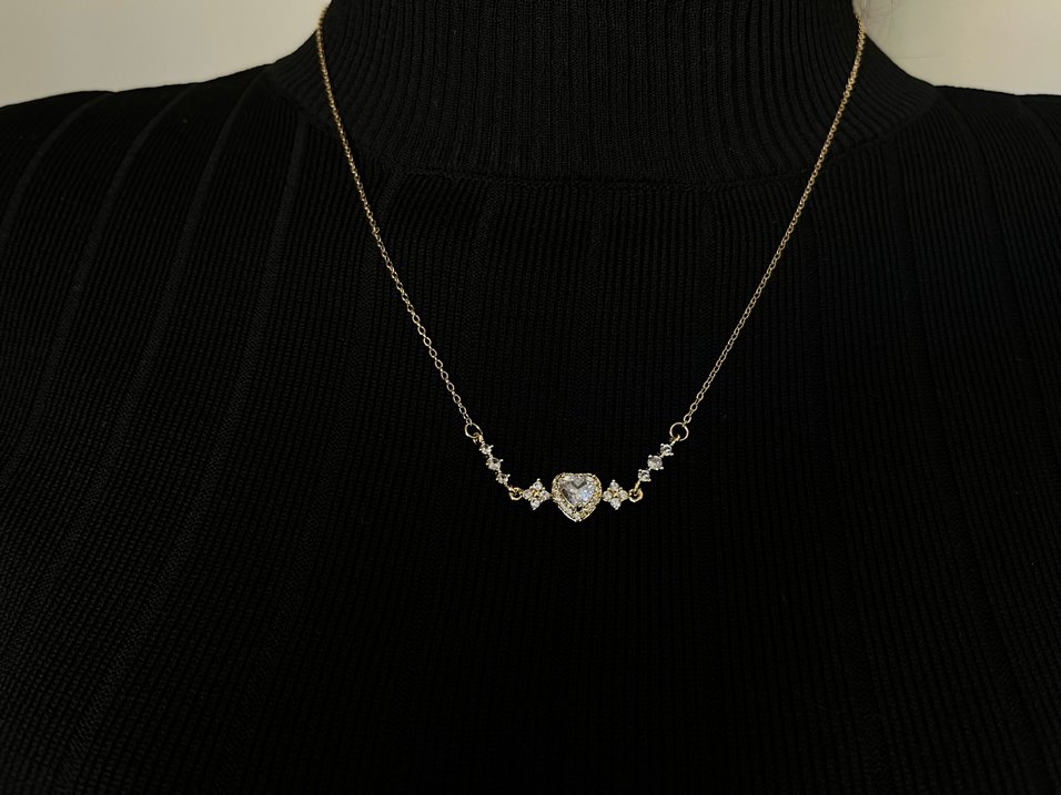 Çelik Altın renginde, kalp şekilli taş süslemeli detaylı çelik kolye, romantik akşamlar için ideal.