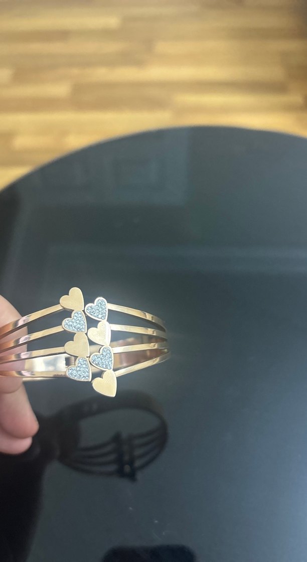 Altın renkli, tokalı kadın bileklik; düz ve taşlı kalp desenleriyle düğünler için uygun.