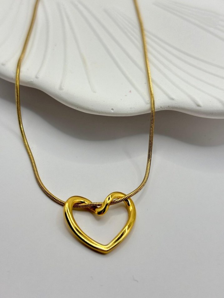 Altın renkli, detaylı zincir ve kalp şeklinde pürüzsüz yüzeyli kolye, romantik akşamlar için uygun.