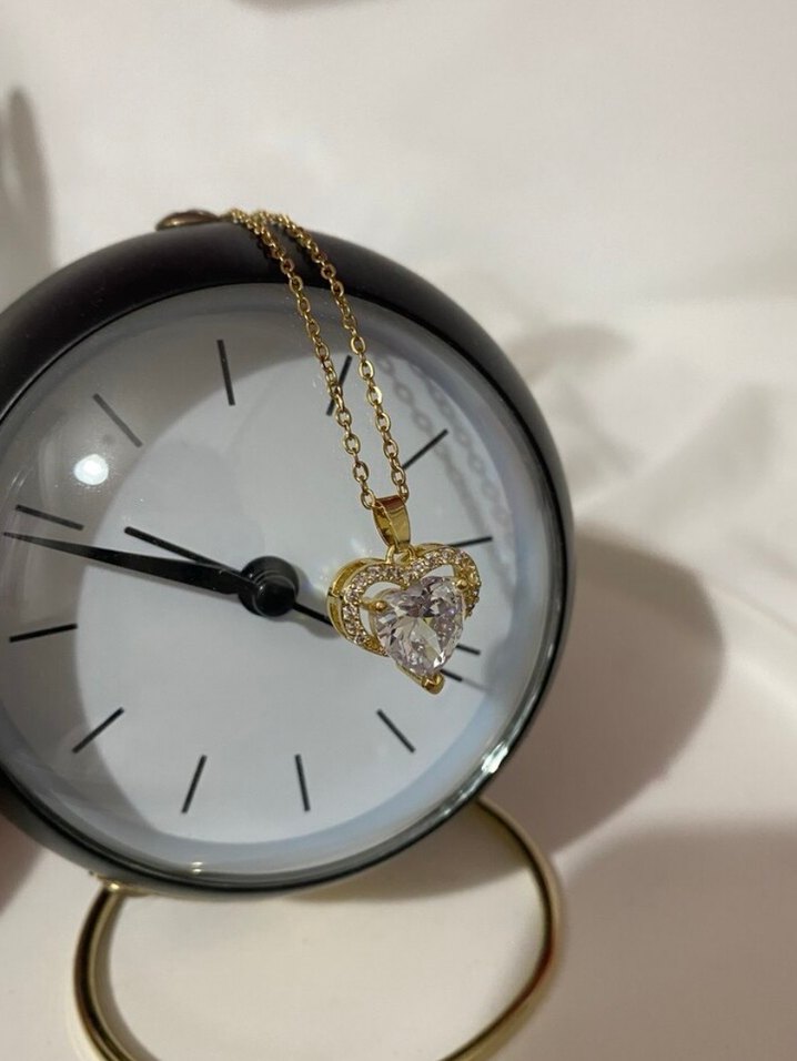 Altın renkli, zincir detaylı kalp şeklinde taşlı kolye. Modern klasik stilde, hafif ve şık görünümüyle romantik anlara uygundur.