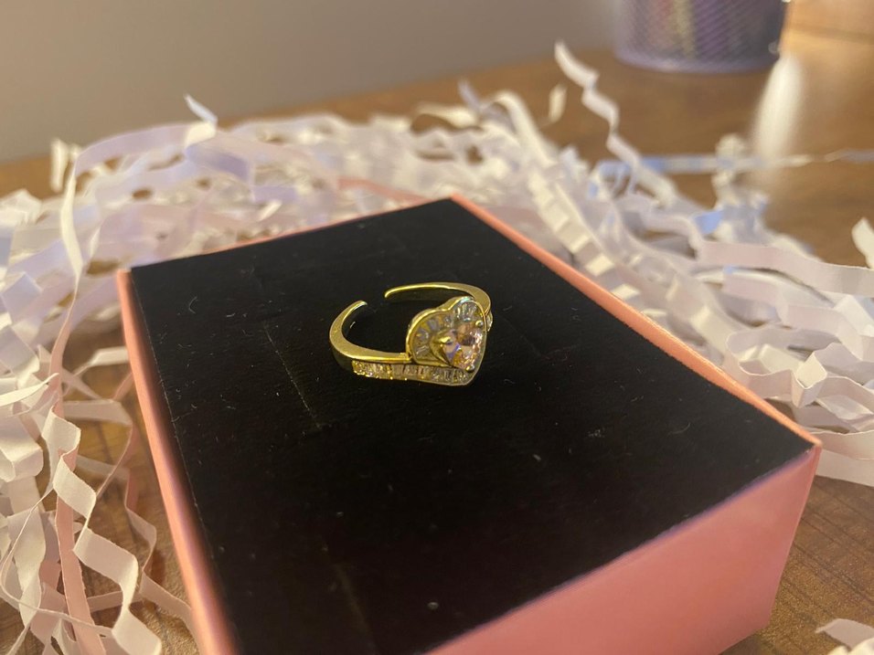 Altın renkli kadın yüzük, kalp figürlü ve payet detaylıdır. Romantik akşamlar için klasik ve bohem tarzı yansıtır.