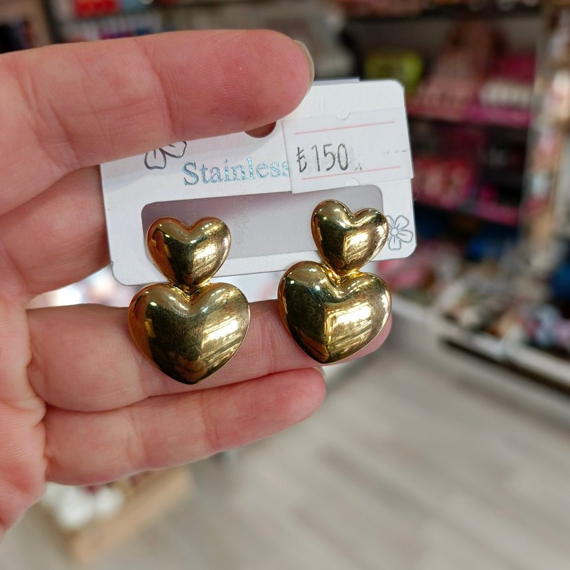 Parlak altın renkli, düğmeli iki kalp figürlü midi uzunlukta küpeler. Vintage ve streetwear tarzını bir araya getirir. Paslanmaz çelikten üretilmiştir.
