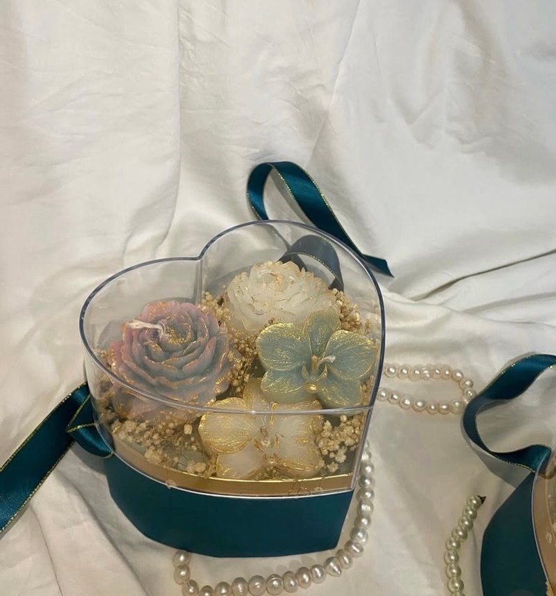 Altın tonlarında kalp şeklinde, şeffaf kapaklı kutuda dekoratif çiçek desenli mum seti. Yumuşak ve zarif bir ışık sağlar.öğretmenler günü için zarif hediye
