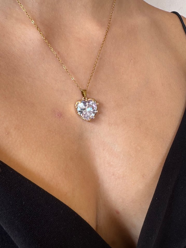 Altın renkli, kalp şeklinde taşlı kolye, modern klasik tarzda ve midi uzunlukta, romantik anlar için uygun. Çelik üründür. Kararma yapmaz.