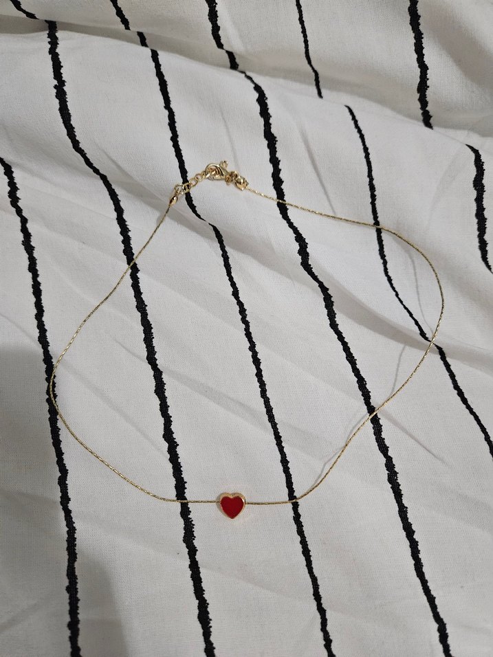 Altın renkli ince zincir üzerinde küçük kırmızı kalp detaylı kolye. Bir heves aldım ama hiç kullanmadım. Sorunsuz