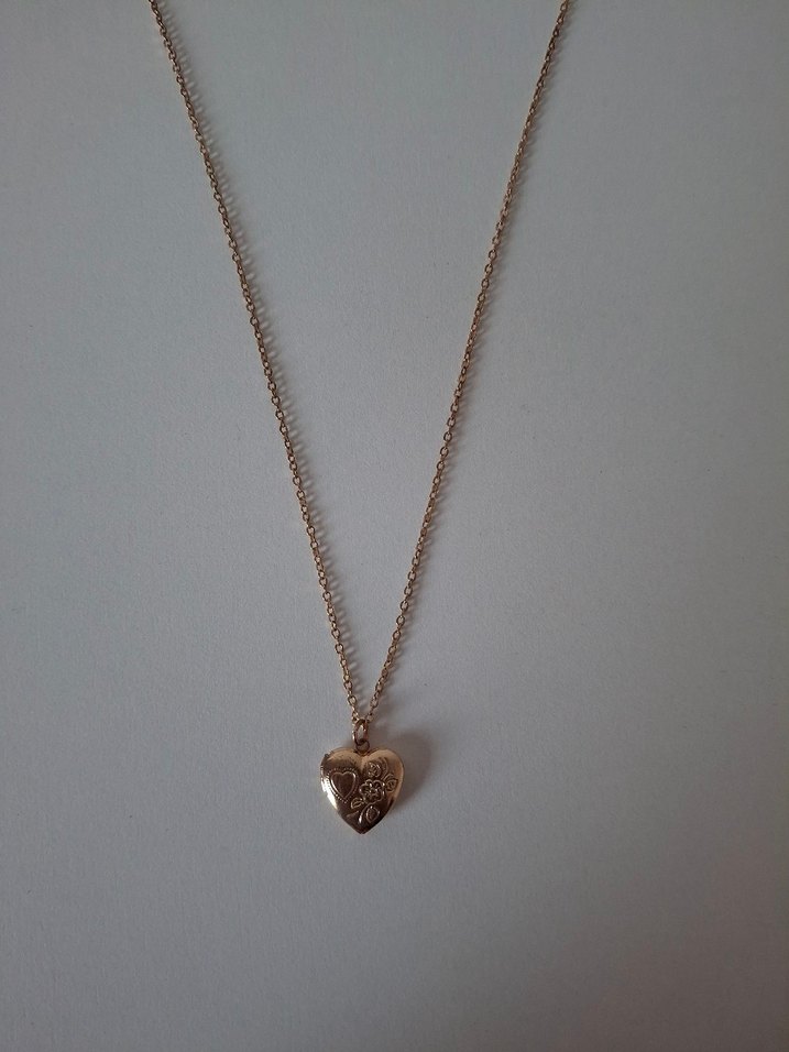 Altın renkli, zincir detaylı ve parlak kalp uçlu midi uzunlukta sade kolye. Bohem Paris tarzında, günlük kullanıma uygun. İşi açılıyor, anlamlı küçük bir şey veya foroğraf konulabilir. Arka kısmında hafif bir karartı mevcut, görselde görüldüğü gibi. Fiyata yansıttım.