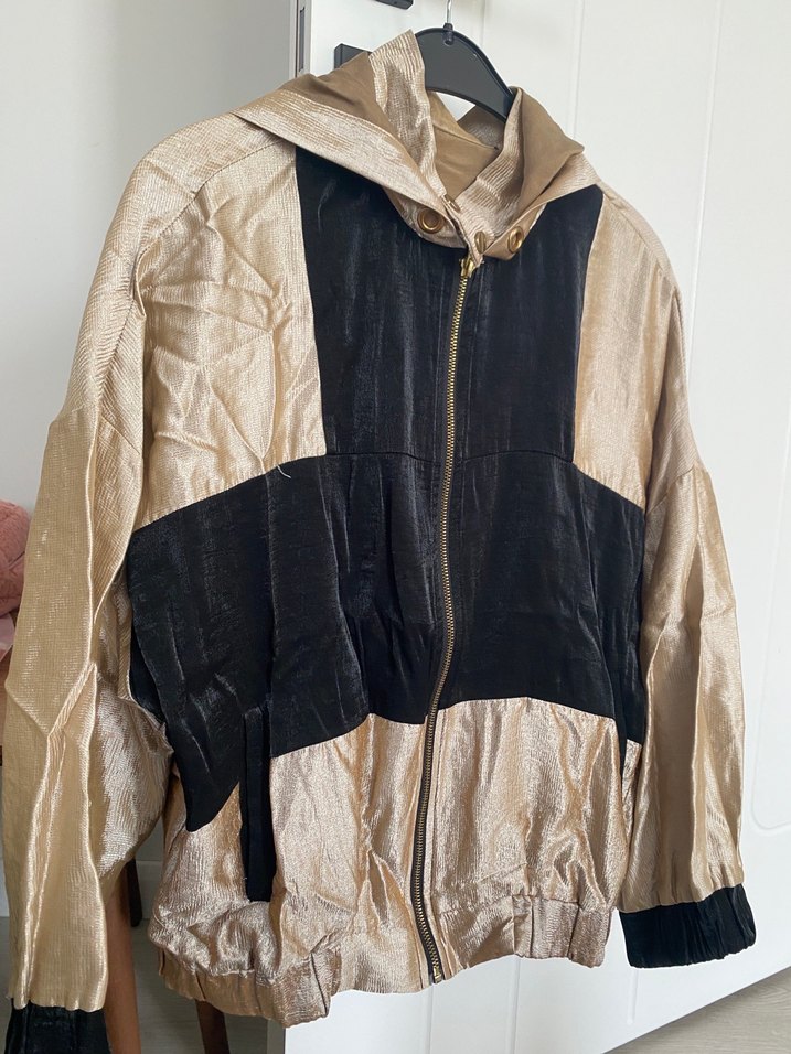 Uzun kollu, kapüşonlu ve fermuarlı, parlak altın ve siyah renklerde keten kumaştan bol kesim kadın ceket. Midi boyda, günlük kullanım için uygun. ✨