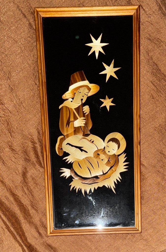 Altın tonlarda, koyu temalı bir tablo. Bir çoban flüt çalıyor, yanında beşik içinde bebek var, üstte üç parlak yıldız bulunuyor. Ahşap çerçeveli. Almanya’dan geldi. Çardak sapından yapılmış handmade üründür