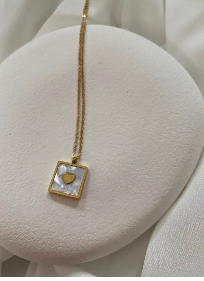 Altın renkli, zincir detaylı midi uzunlukta kare desenli kolye, ortasında küçük kalp figürü ile romantik akşamlar için uygun.