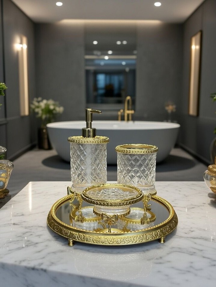 Altın detaylı, kare desenli modern klasik banyo seti; sabunluk, kap ve tepsi içerir. Zarif ve şık tasarım sunar.