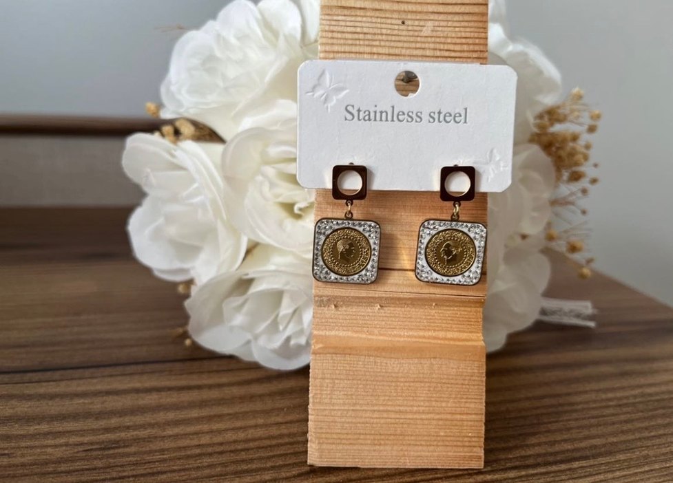 Altın renkli, kısa uzunlukta, payetli ve Çelik çeyrek altın desenli bohem tarzda kadın küpeleri. Paslanmaz çelikten yapılmış, parlak ve minimal görünümlü günlük kullanım için uygun. ✨ Kare zirkon taşlı çerçevenin içerine yerleştirilen çelik çeyrek altınlı küpe, 316 L çelikten üretilmiş olup kararma, solma ya da renk atması gibi olumsuzluklara karşı sağlamdır. Ürünlerinizi daha uzun süreli kullanmak için sizler yine de deodorant, parfüm ya da temizlik malzemesi gibi kimyasal ürünler ile kullanmamaya özen gösteriniz. Her zaman şık ve günlük giyimden özel etkinliklere kadar her zaman mükemmel bir seçenektir. Tarzınızı ve şıklığınızı tamamlayacak bir aksesuar olarak kullanabilirsiniz.