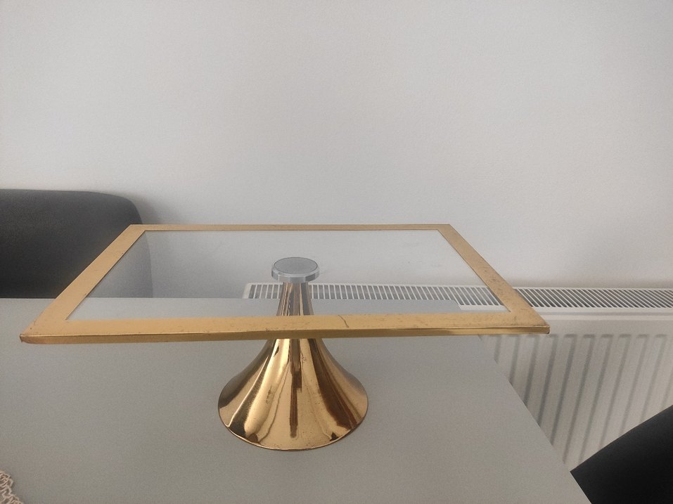 Parlak altın renkli, kareli desenli step platformu, yansıtıcı yüzey ve sağlam taban ile.
