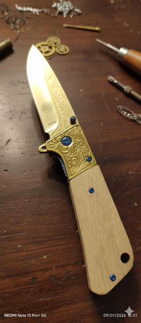 Altın renkli işlemeli metal çerçeve ve koyu renkli ahşap saplı, mavi klipsli katlanır çakı.