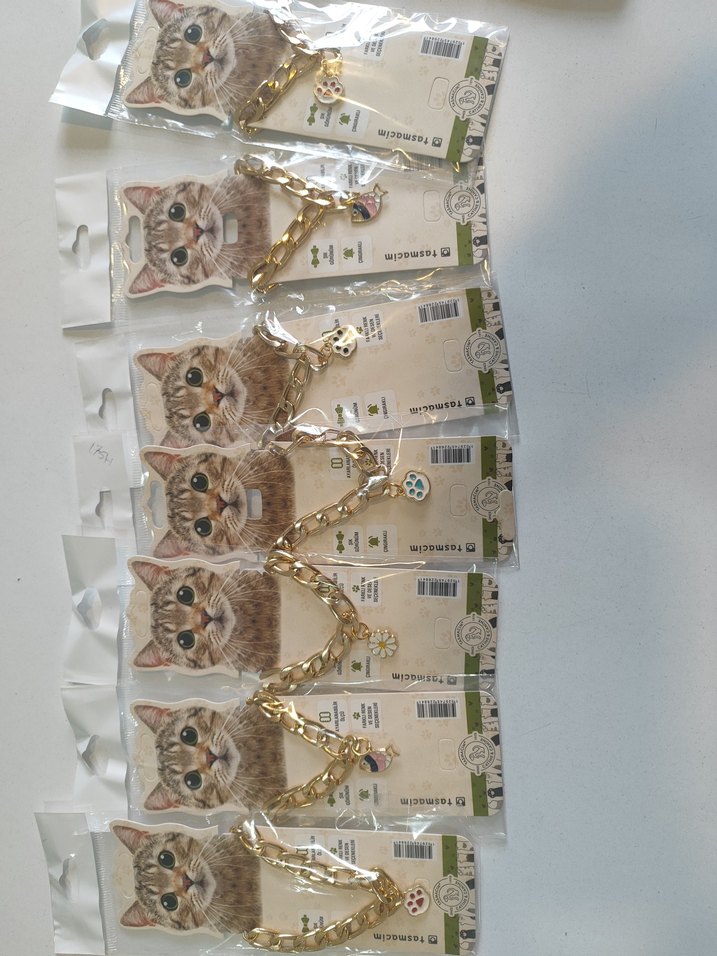 Altın renginde, üzerinde küçük figürler bulunan kedi tasması aksesuarları, tek tek paketlenmiş.
