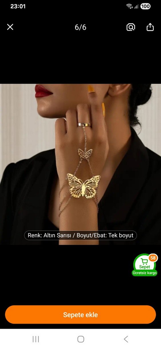 Altın Renkli Kelebek Desenli Zincirli Kadın El Zinciri