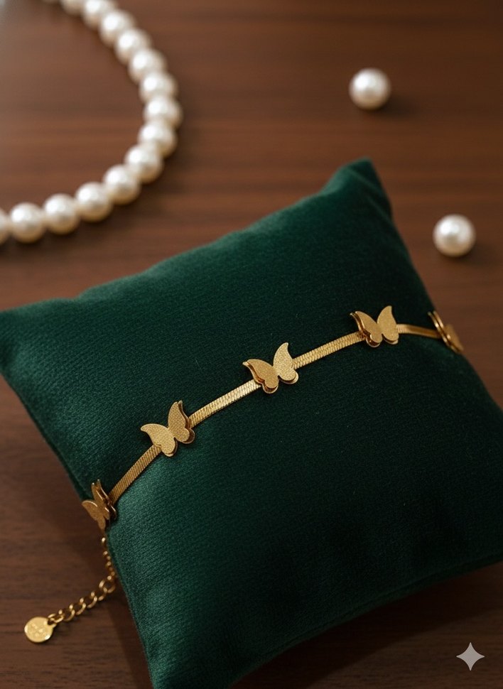 Parlak altın renkli bu bileklik, zarif kelebek detayları ve ince zinciriyle minimalist ve bohem tarzı klasik şıklıkla buluşturuyor. Ürün çeliktir