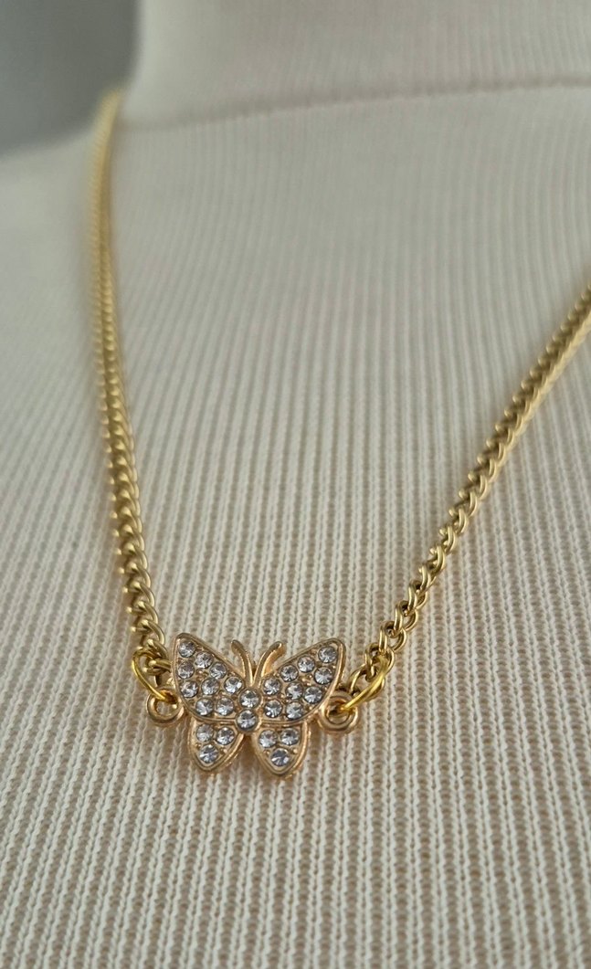 Altın renkli, detaylı zincir ve küçük kristallerle süslenmiş kelebek uçlu kolye. Midi uzunlukta, günlük kullanıma uygun bohem ve klasik şıklıkta. Zincir uzunluğu 50 cm