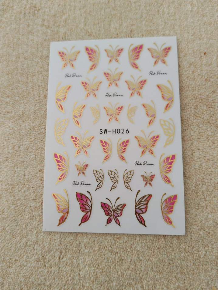 Altın renkli, canlı açık tonlarda kelebek desenli tırnak süsleri. Üzerinde SW-H026 kodu bulunmaktadır.