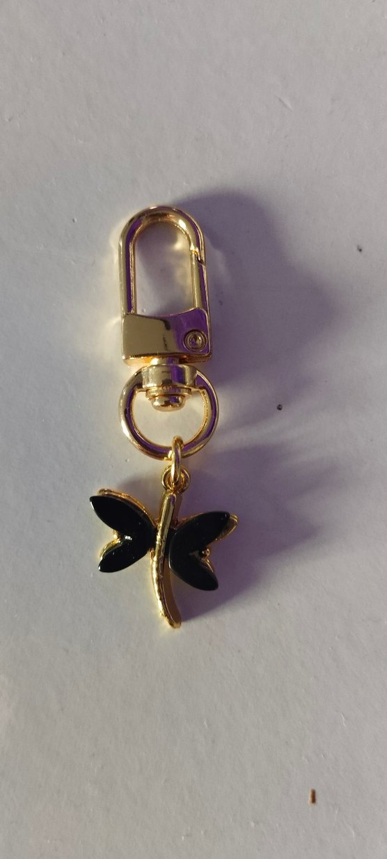 Altın renkli, tokalı anahtarlık üzerinde siyah kelebek figürü bulunan sade ve gotik tarzda aksesuar.