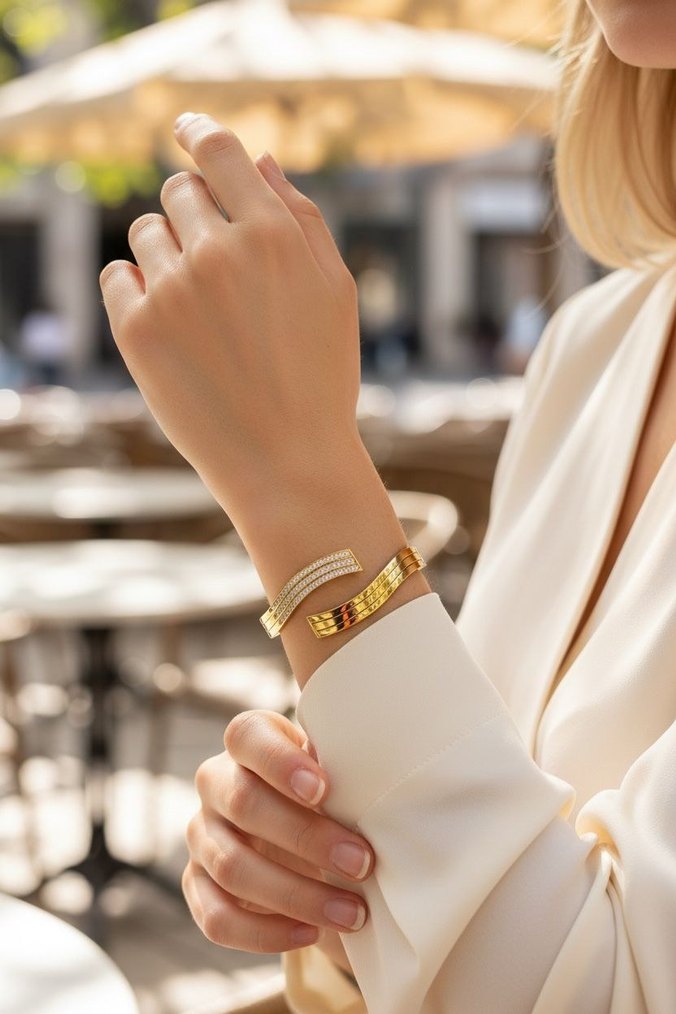 Altın renginde, tokalı ve yılan deseniyle minimal ve çağdaş tarzda günlük kullanıma uygun bileklik.