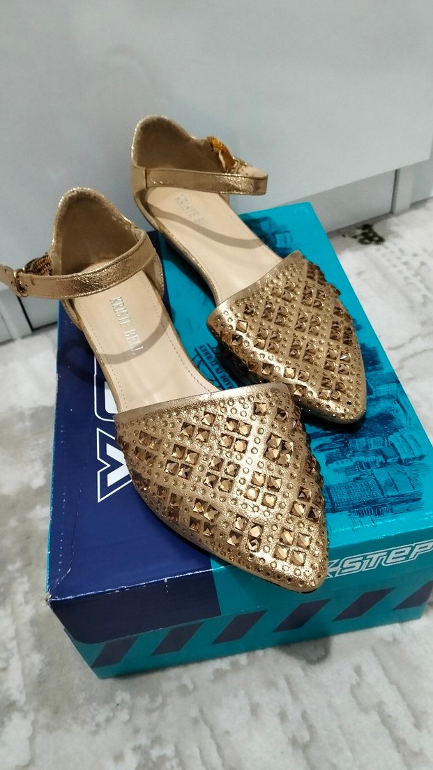 Altın renkli, parlak yılan deseni ve kemerli bilek kayışı olan blok topuklu kadın babet. Günlük kullanım için uygundur, kauçuk malzemeden üretilmiştir.