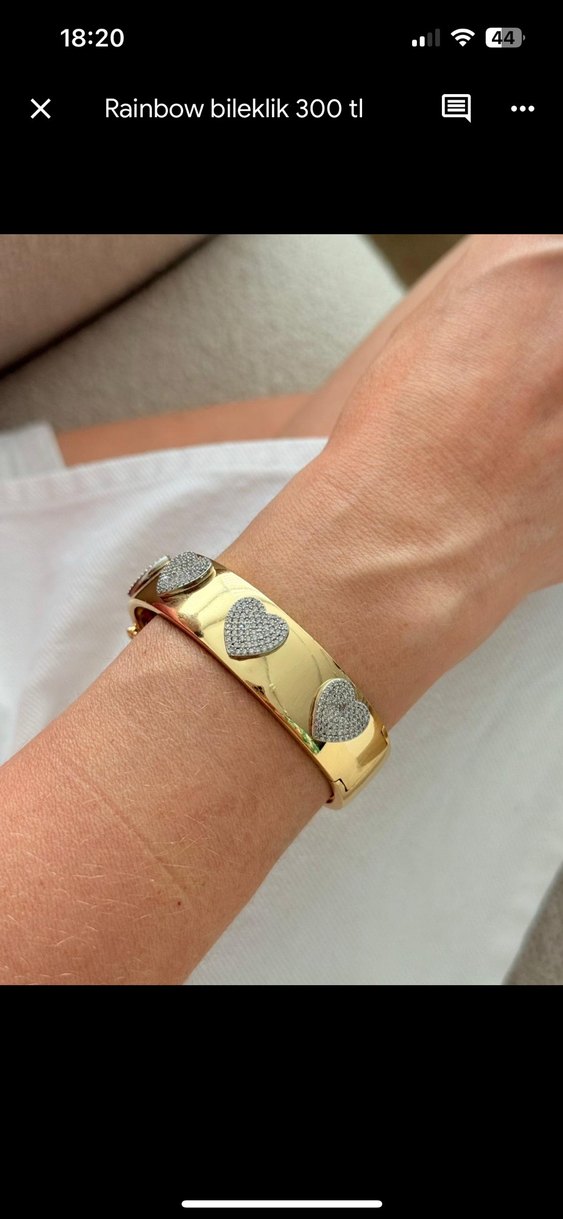 Altın renkli, kemerli bileklik üzerinde kalp desenleri bulunan hafif yılan desenli şık tasarım. Glamour ve trend görünüm için uygun.